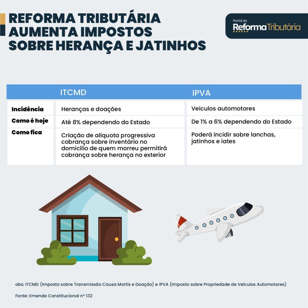 A reforma mantém impostos sobre patrimônio, como IPVA e IPTU, e heranças, como o ITCMD, mas ajusta alguns pontos de sua incidência.