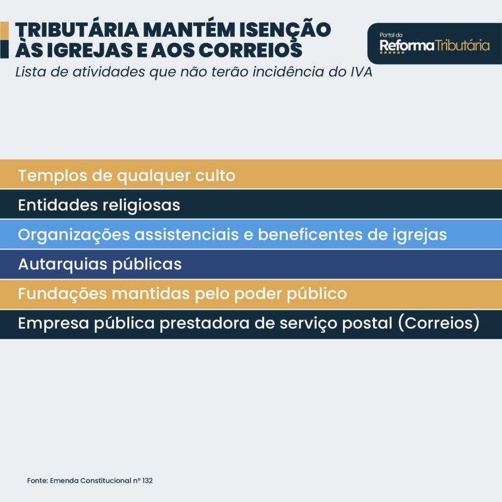 A Constituição mantém a proibição de cobrança de impostos para templos religiosos. Na reforma, esse benefício é estendido para organizações assistenciais e beneficentes mantidas pelas igrejas. Ou seja, a cobrança de tributos fica proibida para: