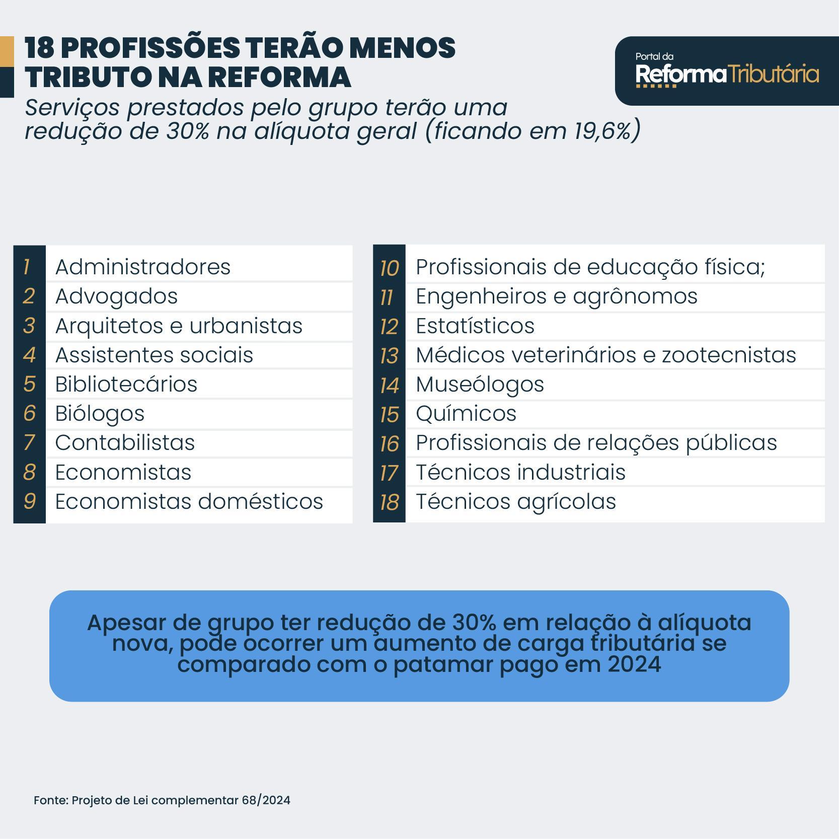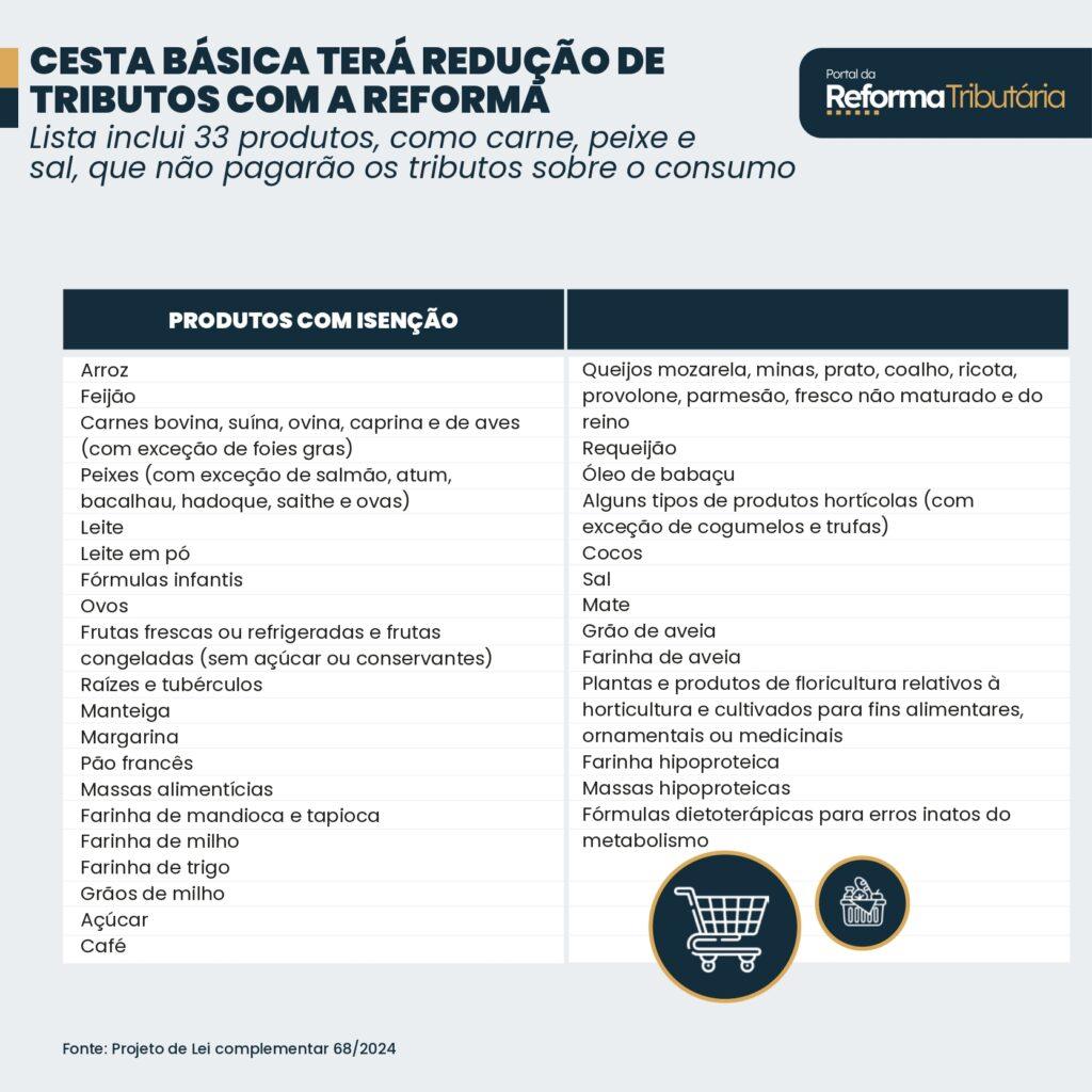O texto também estabelece a criação de uma cesta básica nacional de alimentos, que estará isenta da nova tributação. O tema está sendo discutido no projeto que está em regulamentação no Senado.