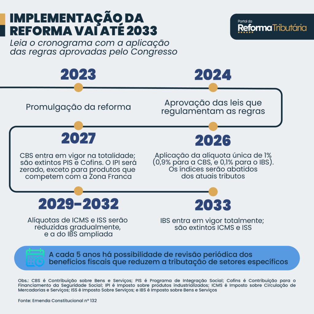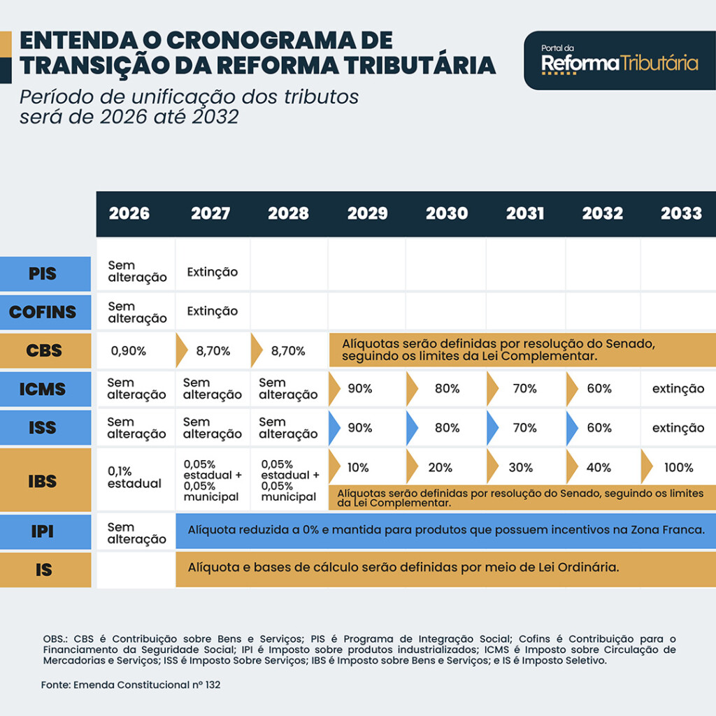 O período de transição começa em 2026, quando o IBS e a CBS serão cobrados simultaneamente com os tributos atuais (PIS, Cofins, IPI, ICMS e ISS), porém com alíquotas reduzidas. A implementação deve durar 7 anos, até 2032.