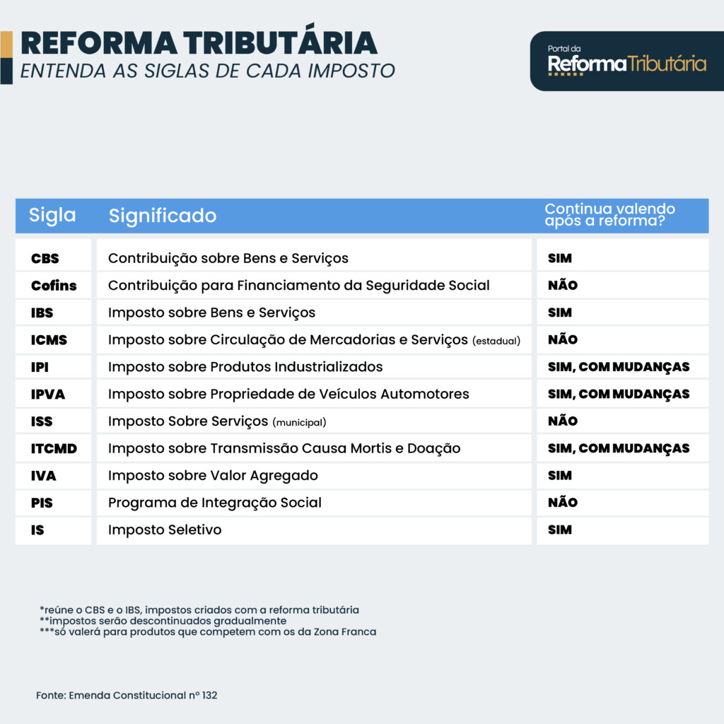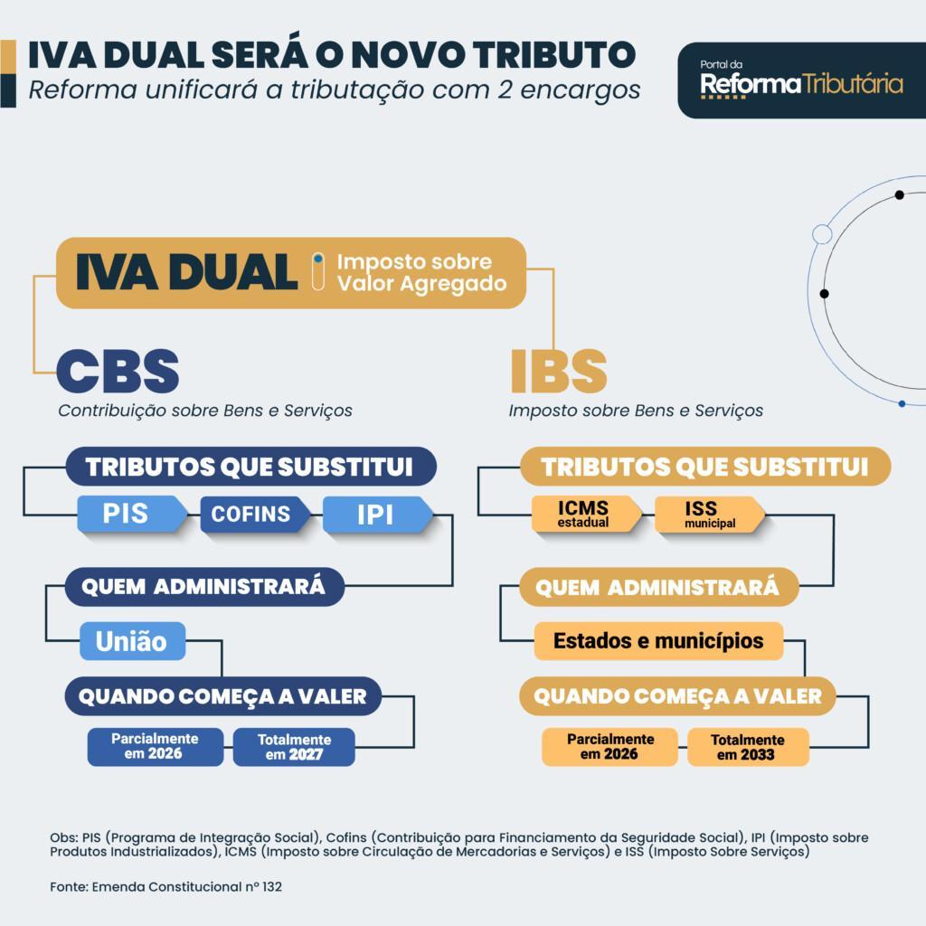 A reforma define que 5 tributos serão substituídos pelo IVA (Imposto sobre Valor Agregado) dual — sendo 1 gerenciado pela União, e outro com gestão compartilhada entre estados e municípios. São eles: