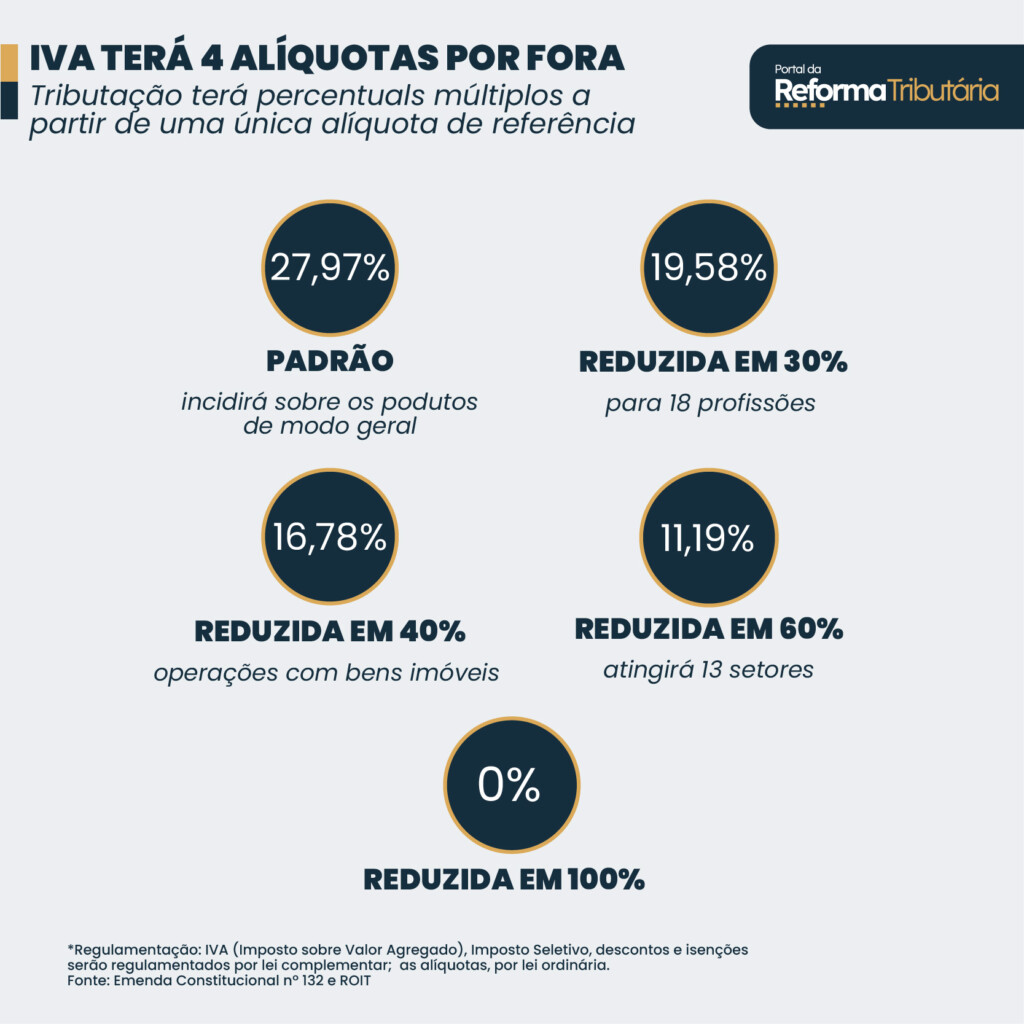 Serão 4 níveis de alíquotas do IVA: a padrão, a intermediária (70% da padrão), a reduzida (40% da padrão) e zero.