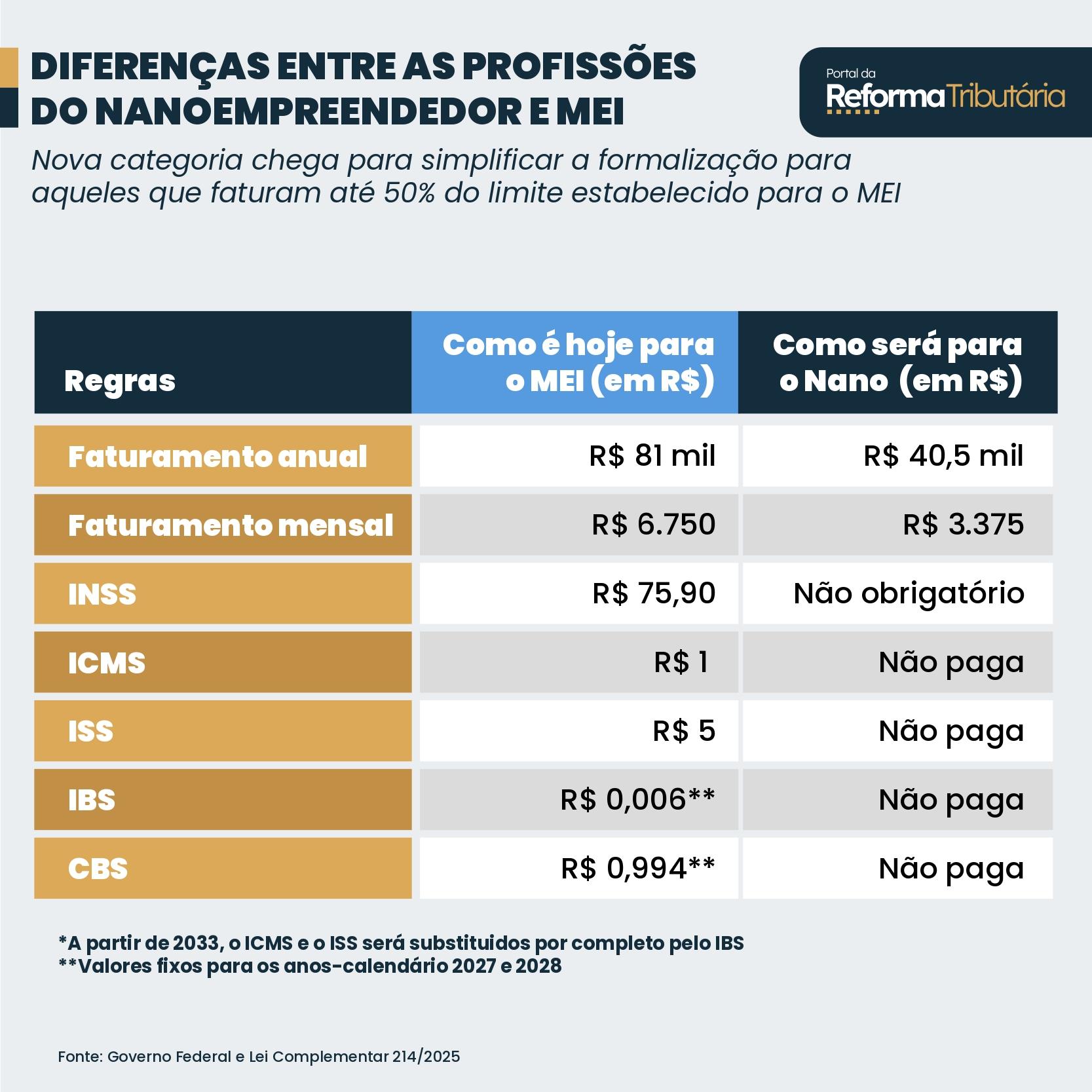 O microempreendedor (MEI), paga, atualmente, INSS, ICMS e ISS em uma única guia. A partir de janeiro de 2026, com a aplicação da alíquota teste, IBS e CBS serão adicionados a lista de impostos a serem pagos pela categoria. Diferente do MEI, o nanoempreendedor não será contribuinte do IBS e CBS, a menos que opte pelo regime regular de tributação.