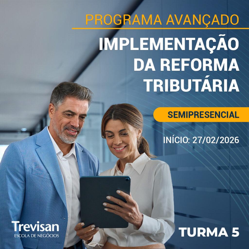 A Trevisan – Escola de Negócios, em parceria com a ROIT, anuncia a abertura da 5ª turma do Programa Avançado de Implementação da Reforma Tributária, uma formação inédita voltada a transformar conhecimento em estratégia e preparar profissionais para liderar as mudanças trazidas pela nova estrutura tributária brasileira.