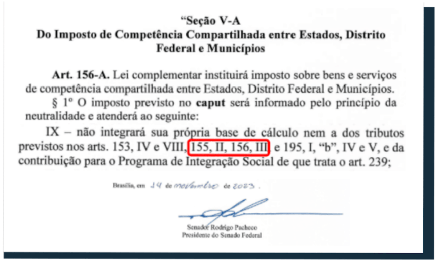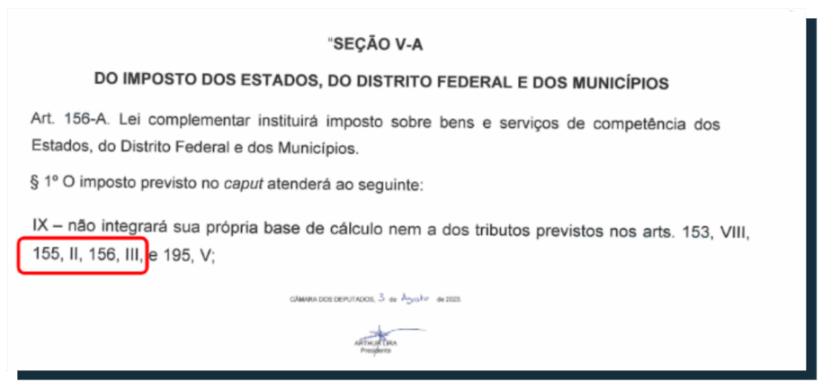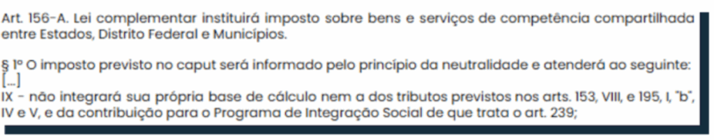 A redação aprovada na Câmara dos Deputados determinava que o IBS e a CBS (Contribuição sobre Bens e Serviços) não integram a base de cálculo do ICMS (Imposto sobre Circulação de Mercadorias e Serviços) durante a transição.
