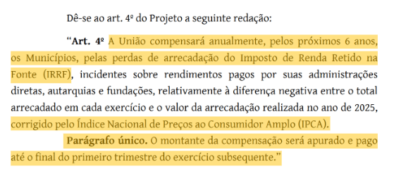 A ideia é colocar no projeto do novo IR (PL 1.087 de 2025) um mecanismo para garantir o pagamento trimestral da receita perdida durante 6 anos. Os valores de referência seriam a arrecadação em 2025, corrigida pela inflação.