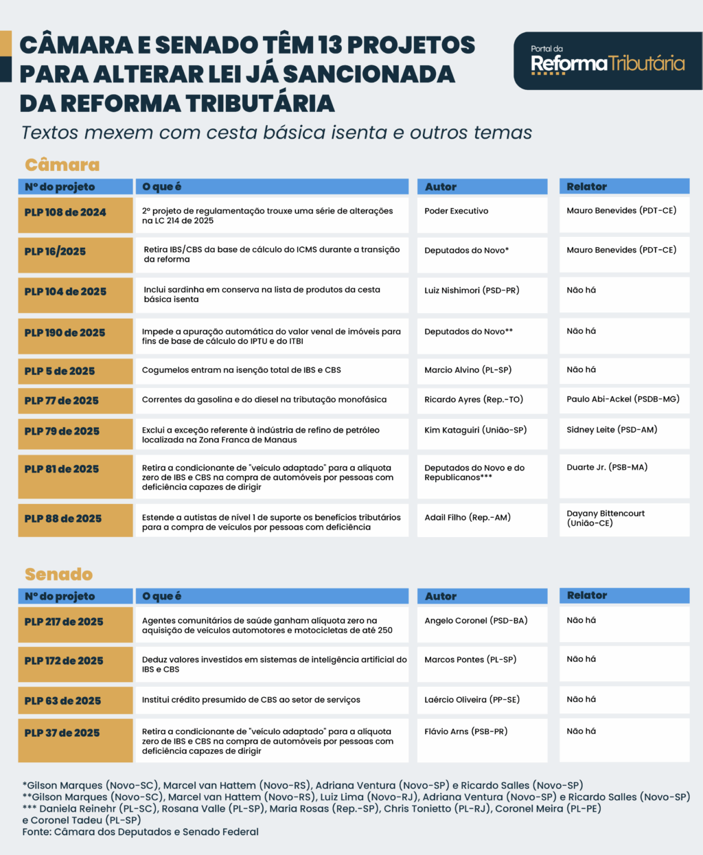 O Portal da Reforma Tributária identificou ao menos 13 projetos em tramitação no Legislativo para fazer alterações na lei já sancionada (LC 214 de 2025) sobre a os novos tributos do consumo. São 9 textos na Câmara e 4 no Senado.