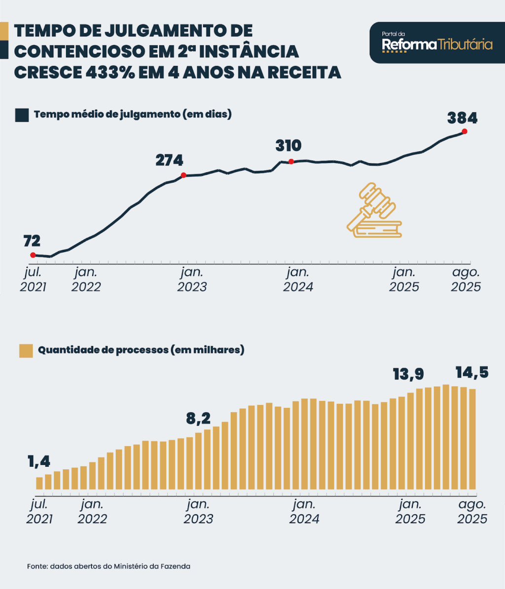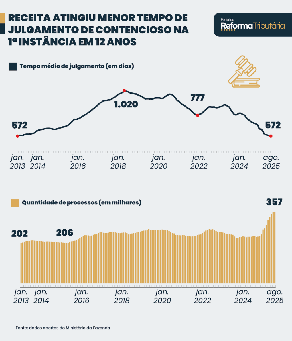 A Receita Federal tem diminuído o tempo médio de julgamento administrativo de contencioso em 1ª instância. O indicador mostra que o período de análise nessa etapa foi de 572 dias em agosto de 2025, o mesmo que em janeiro de 2013 (dado mais antigo disponível) –há mais de 12 anos.