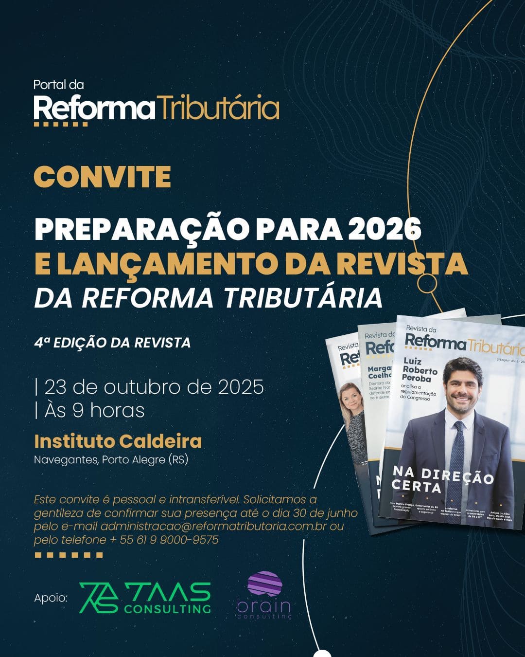 O Portal da Reforma Tributária realiza, em 23 de outubro de 2025, um seminário para mostrar como deve ser a preparação das empresas para 2026 e lançamento da 4ª Edição da Revista da Reforma Tributária, um evento exclusivo com executivos, especialistas e representantes do setor produtivo para compartilhar conhecimento.