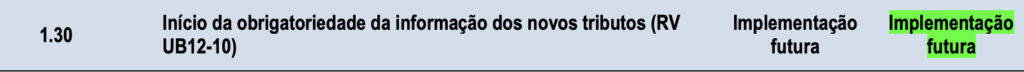 O documento cita que o “início da obrigatoriedade da informação dos novos tributos (RV UB12-10)”, trazido na versão 1.30, está sujeito a “Implementação futura”, ainda sem data definida.