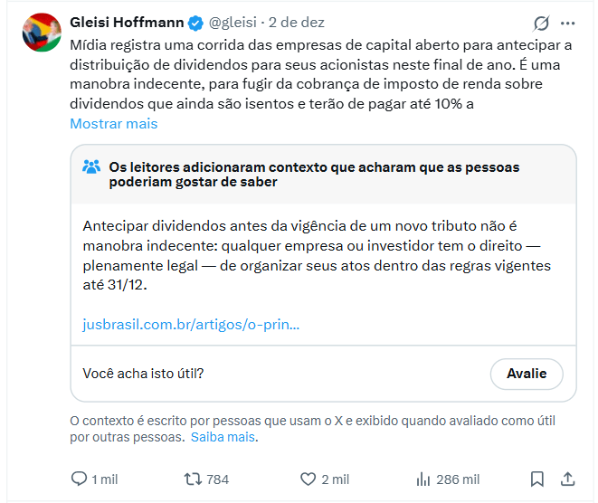 Na própria rede social, uma observação realizada por comentário dos usuários declarando o seguinte: “Antecipar dividendos antes da vigência de um novo tributo não é manobra indecente: qualquer empresa ou investidor tem o direito”.