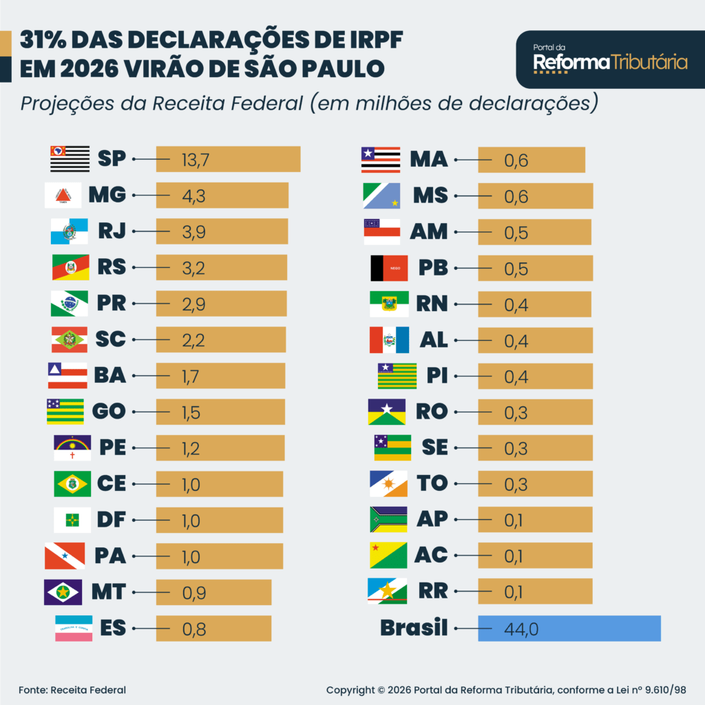 O Ministério da Fazenda também divulgou as expectativas de declarações por estado em 2026. São Paulo lidera o ranking, com 13,7 milhões de informes esperados. Leia o detalhamento abaixo: