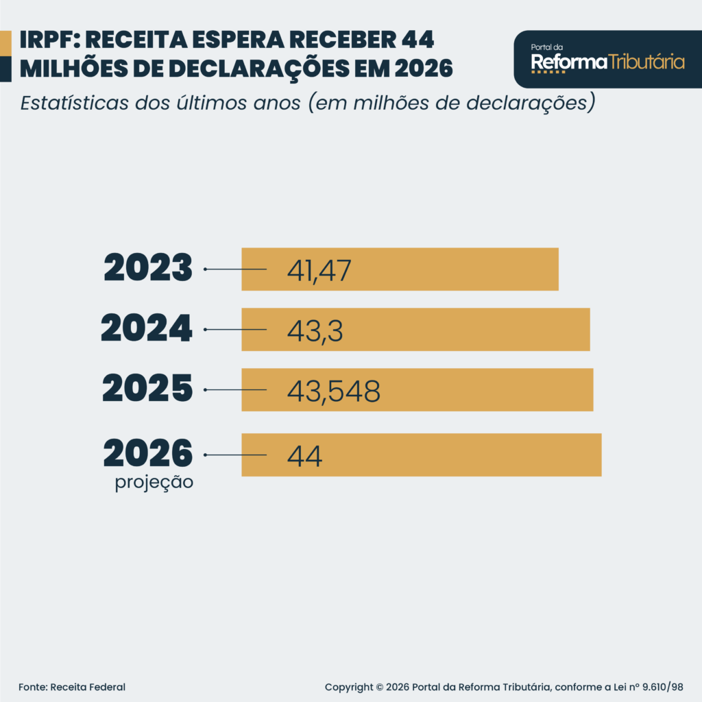 A Receita Federal espera receber 44,0 milhões de declarações de IRPF (Imposto de Renda da Pessoa Física) em 2026, segundo projeções divulgadas nesta 2ª feira (16.mar.2026). O valor é levemente superior às 43,5 milhões de declarações de 2025. O prazo para envio abre dia 23 de março e termina em 29 de maio.
