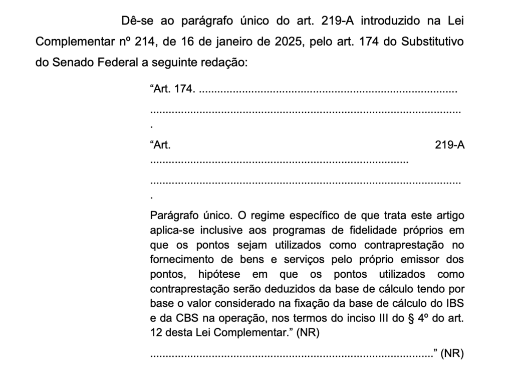 O Senado havia determinado que os pontos concedidos de forma não onerosa em programas de fidelidade entravam na conta da tributação pela categoria. Só que o texto aprovado pelos deputados retirou a previsão e retomou a redação original, aprovada em outubro de 2024.
