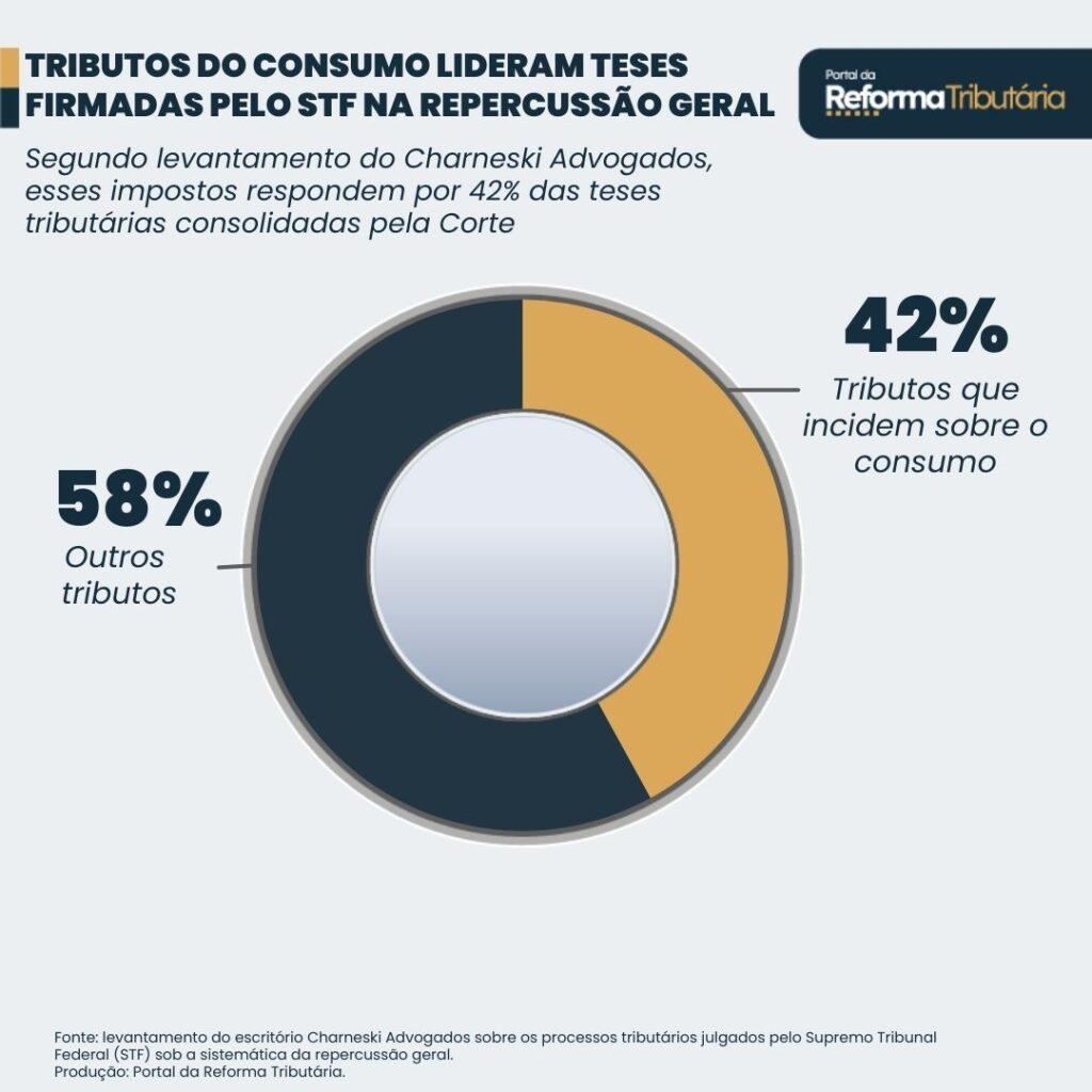 Um levantamento do escritório Charneski Advogados mostra que os tributos incidentes sobre o consumo, como PIS, Cofins, ICMS, ISS e IPI, respondem por 42% das teses tributárias firmadas pelo Supremo Tribunal Federal (STF) no âmbito da repercussão geral, o que evidencia a centralidade dessas matérias no contencioso constitucional tributário.