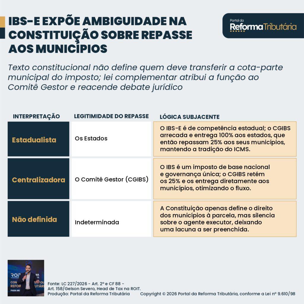 O argumento reside na seguinte lógica: se a receita do IBS-E é de competência estadual e a Constituição afirma que a parcela municipal vem do montante “distribuído aos Estados”, a retenção e o repasse direto pelo CGIBS representariam uma violação da autonomia do ente federativo. Os Estados podem alegar que a lei complementar usurpou uma prerrogativa sua, que seria a de receber 100% de sua receita e, só então, efetuar a transferência constitucionalmente prevista aos seus municípios.