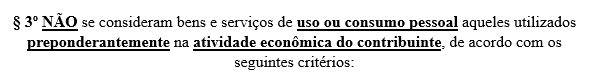 O § 3º estabelece que não se consideram bens e serviços de uso ou consumo pessoal aqueles utilizados preponderantemente na atividade econômica do contribuinte, conforme os seguintes critérios: