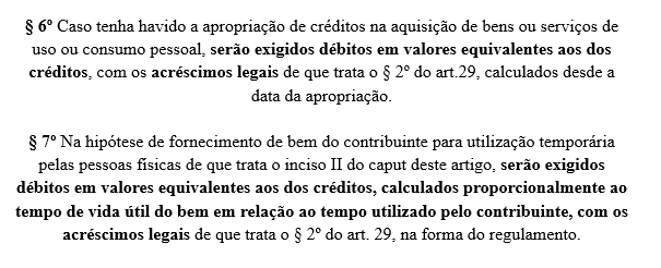 Nos §§6º e 7º, a norma trata das consequências da apropriação indevida de créditos, determinando a exigência de débitos equivalentes aos créditos apropriados, acrescidos de encargos legais. No caso de fornecimento temporário de bens a pessoas físicas vinculadas ao contribuinte, os débitos serão proporcionais ao tempo de uso em relação à vida útil do bem, conforme regulamentação específica.