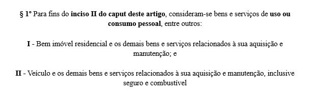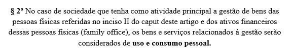 Comentário – O §2º trata especificamente das sociedades conhecidas como family offices, cuja atividade principal é a gestão de bens e ativos financeiros de pessoas físicas. Nesses casos, os bens e serviços relacionados à gestão são presumidos como de uso pessoal, reforçando o caráter restritivo da norma.