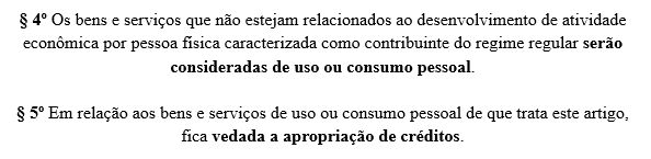 Comentário – O §4º reforça que, no caso de pessoas físicas enquadradas como contribuintes do regime regular, os bens e serviços não relacionados à atividade econômica também serão considerados de uso pessoal. Já o §5º estabelece a vedação expressa à apropriação de créditos sobre bens e serviços de uso pessoal, consolidando o objetivo de impedir o aproveitamento indevido de créditos tributários.