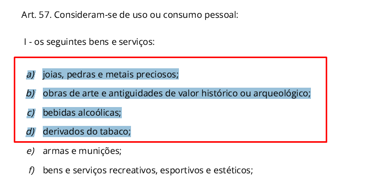 - São luxuosos ou não essenciais, como joias, obras de arte, bebidas alcoólicas, tabaco, armas, munições e itens estéticos ou recreativos;