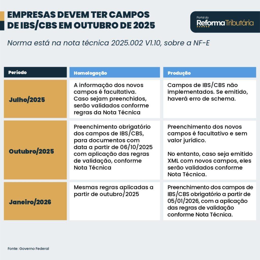 - A partir de outubro de 2025, todos os documentos fiscais eletrônicos deverão conter os novos campos referentes à CBS e ao IBS.