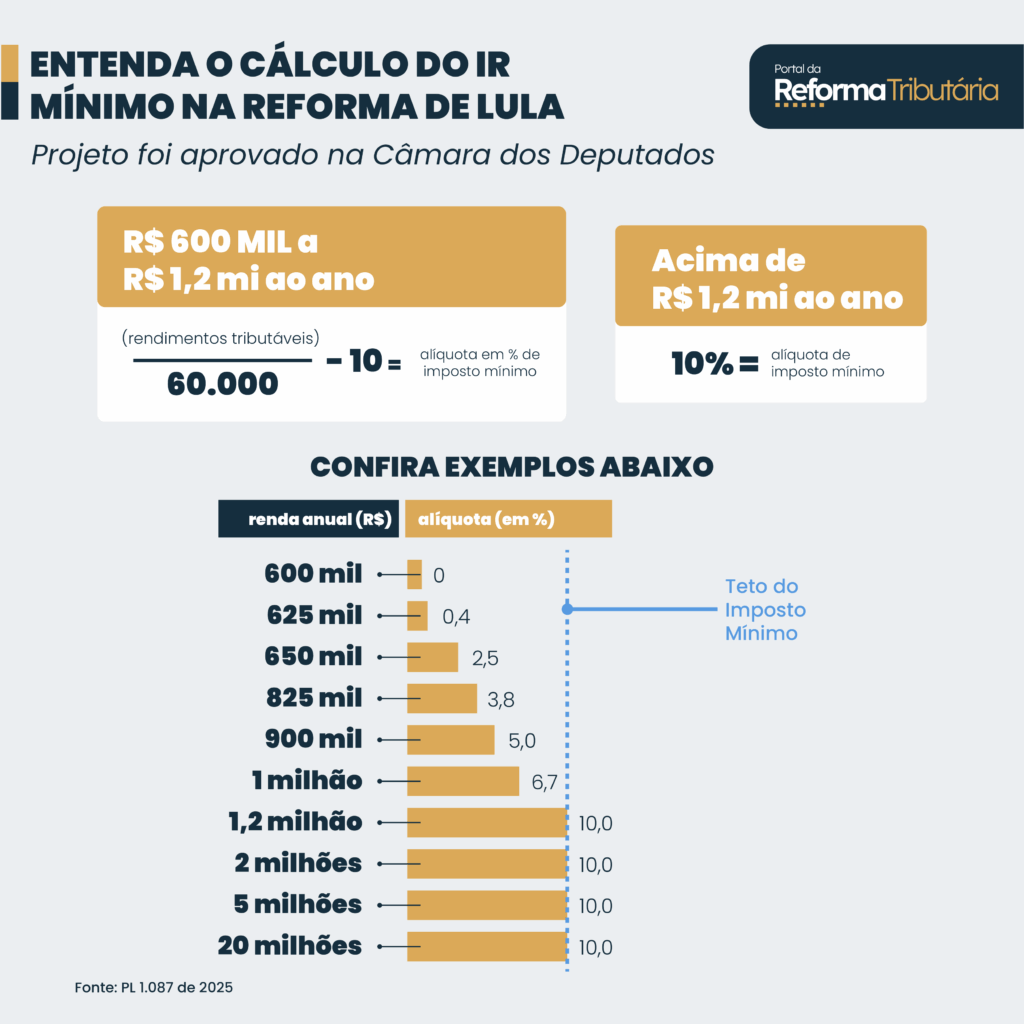 Será cobrado o Imposto Mínimo cheio de 10% para essa faixa. Isso significa que haverá uma cobrança adicional em relação à atual, que tende a ficar abaixo desse percentual para as rendas mais altas.