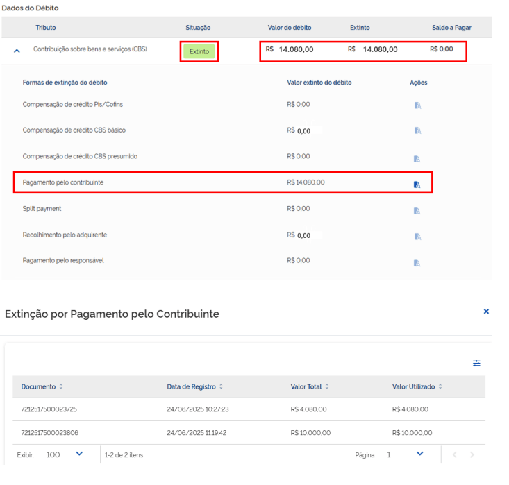 Depois do pagamento registrado, o AA atualiza automaticamente o saldo, que passa a zero, e o débito aparece como “extinto”. A plataforma permite detalhar toda a operação, visualizando como o valor pago foi utilizado, o histórico de quitação e, se houver mais de um pagamento, cada etapa da extinção. Também é possível consultar o demonstrativo vinculado à nota fiscal, com todas as movimentações consideradas na apuração.
