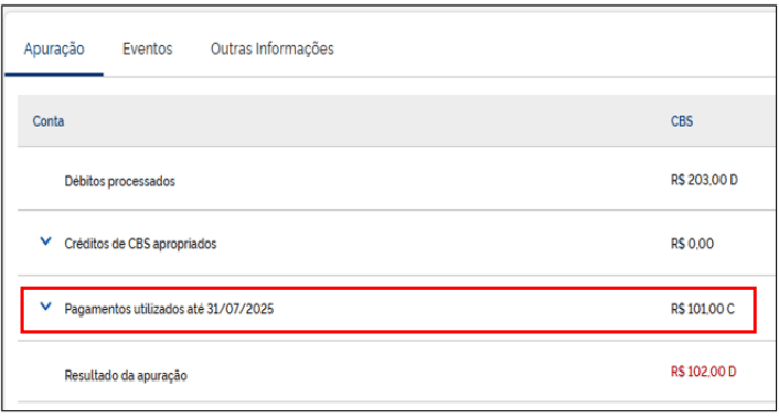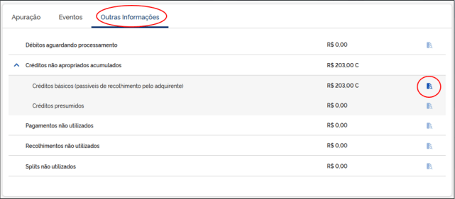 Mesmo com a compra registrada, o crédito ainda não aparece apropriado, pois só é considerado quando o débito correspondente do fornecedor já foi extinto, regra central da apuração. No entanto, é possível visualizar a expectativa de crédito na aba “Outras Informações”, onde o sistema indica que o valor está “passível de recolhimento pelo adquirente”. Assim, mesmo com resultado da apuração zerado, o AA já reflete a operação e prepara o crédito para futura apropriação.