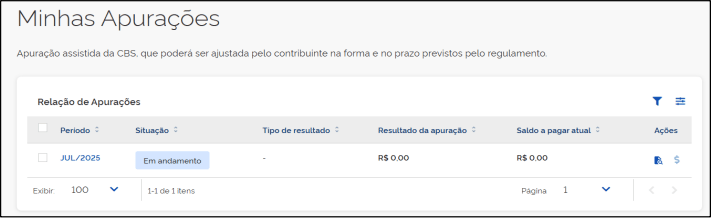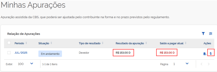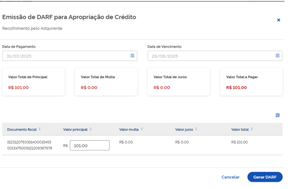 Para simular um recolhimento integral de CBS em uma compra já registrada, o contribuinte pode apropriar o crédito mesmo antes da extinção do débito pelo fornecedor. No AA, ao detalhar o crédito pendente, o sistema já oferece a opção de gerar o DARF de recolhimento, recurso que fica disponível enquanto houver crédito ainda não apropriado. É possível pagar cada operação individualmente ou mais de uma ao mesmo tempo, embora, para fins de teste, recomende-se trabalhar com apenas um documento por vez.